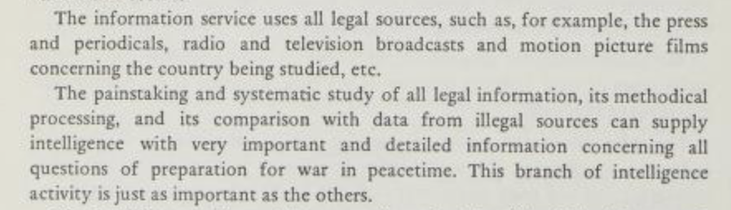 This perspective can also be observed in an old KGB manual on ‘Information work’ which was published some years ago. In the manual as the first requirement for ‘intelligence information’ it is prescribed that the information should be truly secret, covering the behind-the-scenes side of events, secret plans and intentions of the enemy (KGB, undated. See also a previous post on this manual). It is explicitly mentioned that no value is seen in information from open sources.